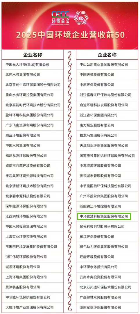 “中國環(huán)境企業(yè)營收前50”(原“中國環(huán)境企業(yè)50強”)榜單由環(huán)境商會自2018年起每年發(fā)布,在業(yè)界享有極高的公信力和權(quán)威性。本次評選嚴(yán)格按照往屆評選標(biāo)準(zhǔn),以企業(yè)申報為基礎(chǔ),以公正公開為原則,以真實數(shù)據(jù)為依據(jù),結(jié)合上規(guī)模環(huán)境企業(yè)調(diào)研,按照2024年度營業(yè)收入總額降序排列產(chǎn)生,旨在凸顯領(lǐng)軍企業(yè)示范引領(lǐng)作用,推動產(chǎn)業(yè)高質(zhì)量發(fā)展。中環(huán)寰慧集團曾入選“2023中國環(huán)境企業(yè)50強”榜單,本次再次入選,是市場與行業(yè)對其長期深耕、穩(wěn)健增長的高度認(rèn)可。